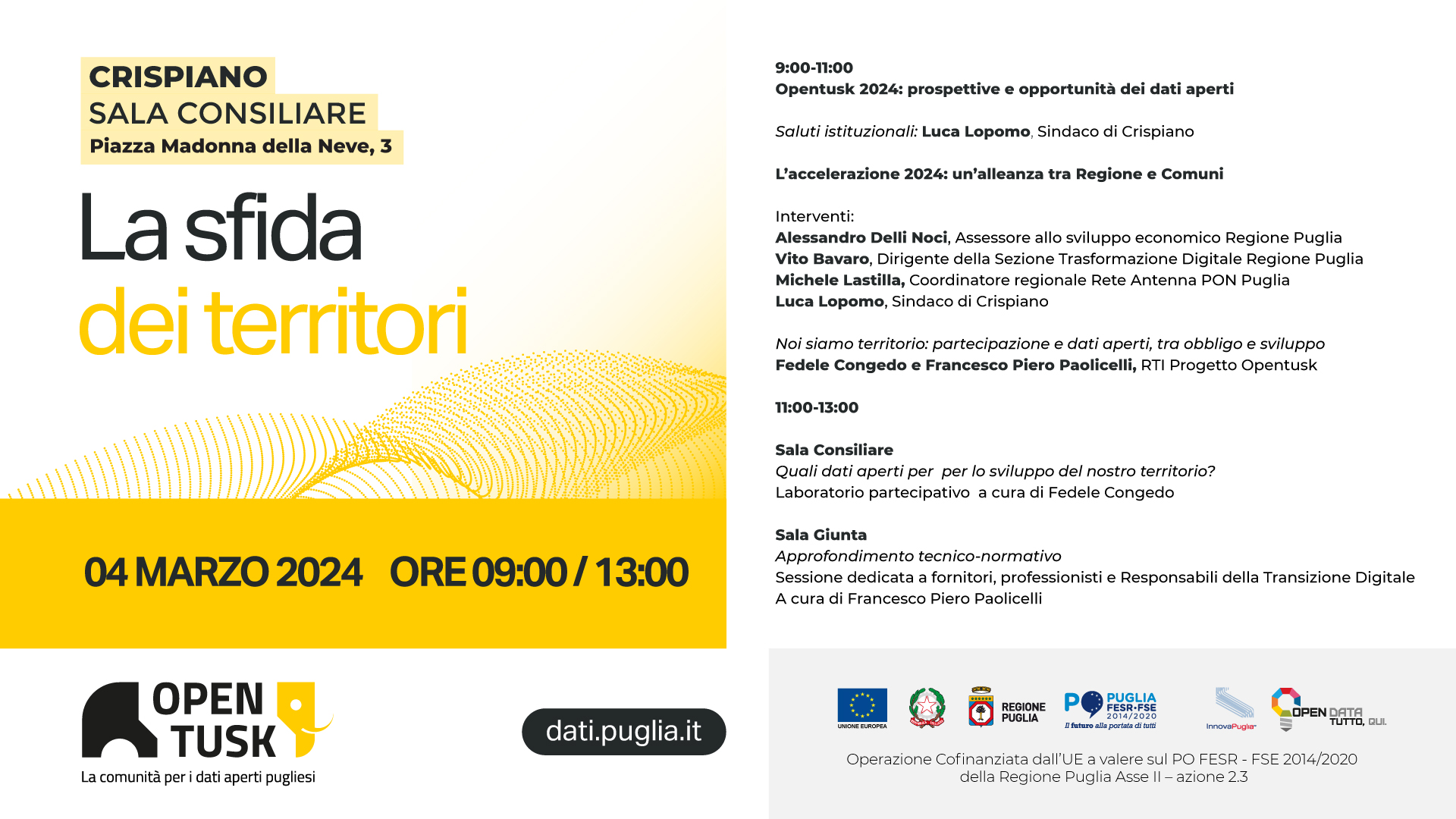 Riprendono le attività di Opentusk, il progetto partecipativo avviato nel 2023 dalla Sezione Trasformazione Digitale per rafforzare la consapevolezza dell’importanza strategica dei dati aperti, supportando gli Enti Locali, il mondo economico, della ricerca, dell’innovazione e del terzo settore. Il percorso istituzionale, che ha ottenuto la menzione speciale dell'Osservatorio Agenda Digitale del Politecnico di Milano, prosegue il cammino nei territori, con 8 incontri dedicati nei Comuni pugliesi, a partire da quelli che si sono distinti nella produzione di dati aperti, in modo da valorizzare la loro esperienza istituzionale e promuovere opportunità e prospettive regionali, connesse alla pubblicazione e al riutilizzo dei dati aperti, a vantaggio delle altre Amministrazioni vicine, degli Enti di Terzo Settore e degli operatori economici più prossimi. L’auspicio è quello di una più ampia adesione alla D.G.R. n. 584 del 03.05.2023, che prevede la possibilità per gli Enti Locali e i soggetti privati che svolgono servizi pubblici di sottoscrivere un accordo con Regione Puglia, per pubblicare i propri dati aperti direttamente nella piattaforma regionale, ai fini di un aumento complessivo di risorse per cittadini, imprese e attori territoriali pugliesi.